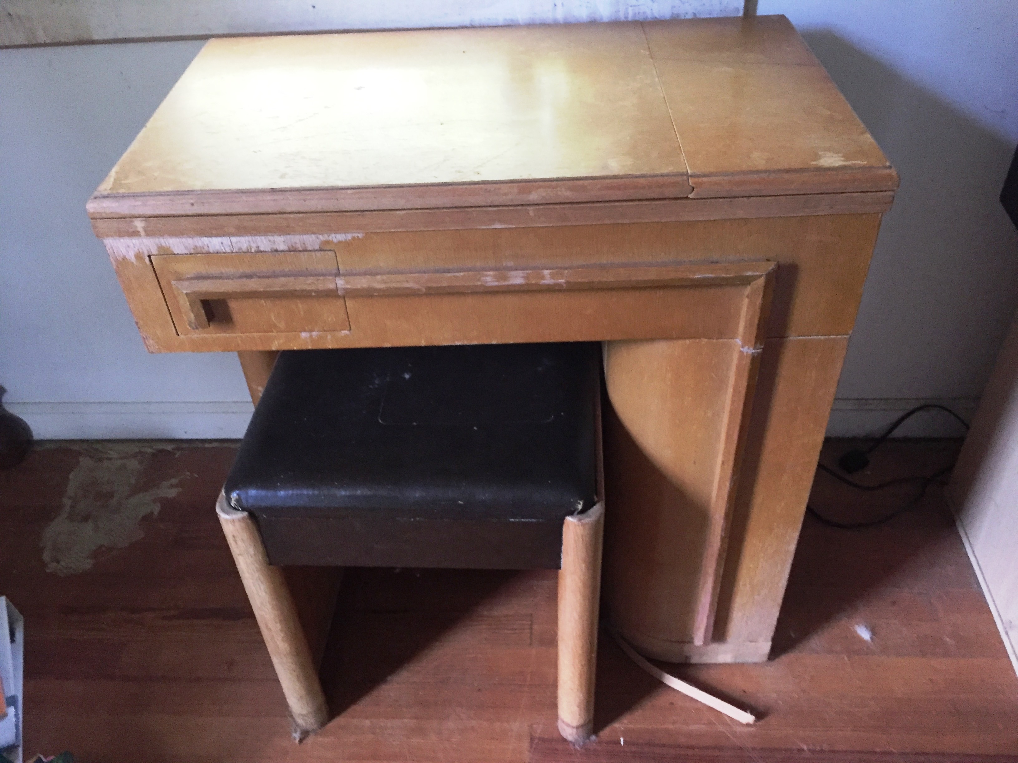 The case is pretty neat. Even my husband likes it and he’s an artisan, so his opinion matters to me. He told me a little how it was made and said it would look nice all fixed up. I haven’t checked to see if the machine works, but eventually I will have it cleaned and oiled and the electric cord replaced. It might cause an electrical fire if I use it now.